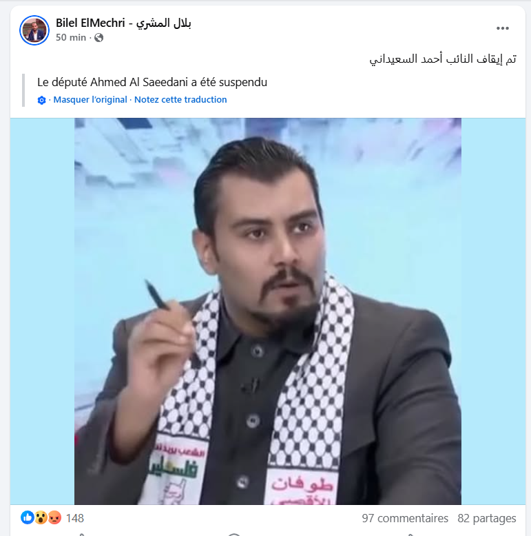 أعلن النائب بمجلس نواب الشعب بلال المشري، مساء اليوم الأربعاء 4 فيفري 2026، أنه تم تم إيقاف النائب أحمد السعيداني في تدوينة على صفحته الخاصة بموقع التواصل الاجتماعي الفايسبوك دون توضيح لأسباب هذا الإيقاف. في حين لم تؤكد جهات رسمية الخبر إلى حد الآن .