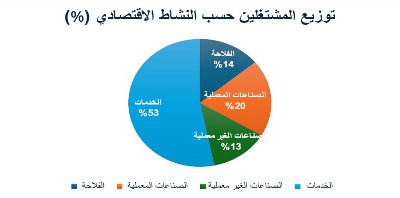 واستحوذ قطاع الخدمات على 53% من عدد المشتغلين ويليه قطاع الصناعات المعملية بـ 20%، ثمّ الصناعات غير المعملية بـ 13%، والفلاحة والصيد البحري بـ 14%.