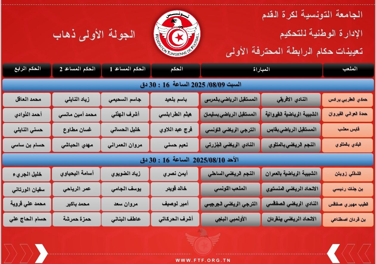أعلنت الإدارة الوطنية للتحكيم عن تعيينات حكام الجولة الافتتاحية لبطولة الرابطة المحترفة الأولى لكرة القدم، وجاءت كالتالي: