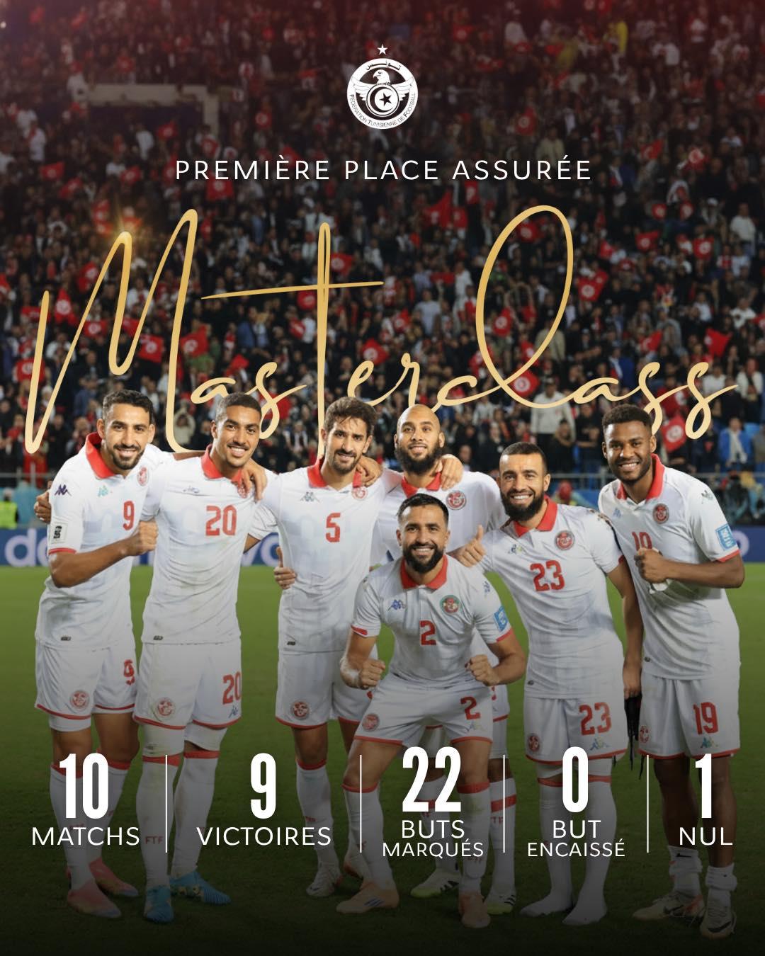 وحقق “نسور قرطاج” سلسلة نتائج إيجابيّة جمعت بين الانضباط الدفاعي والدقة الهجومية، حققوا خلالها 9 انتصارات وتعادل واحد، وسجلوا 22 هدفاً محافظين على نظافة شباكهم.
